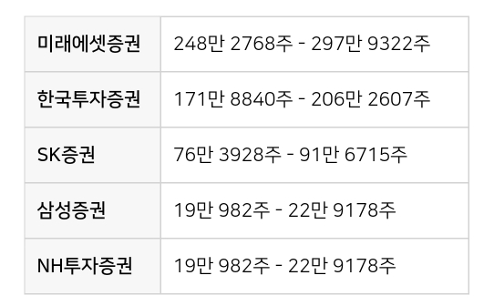 헬스장에서까지 공모주 투자 얘기가 들리는 국민 공모주가 된 상황이라 배정 주수는 1주를 예상하고 있습니다.